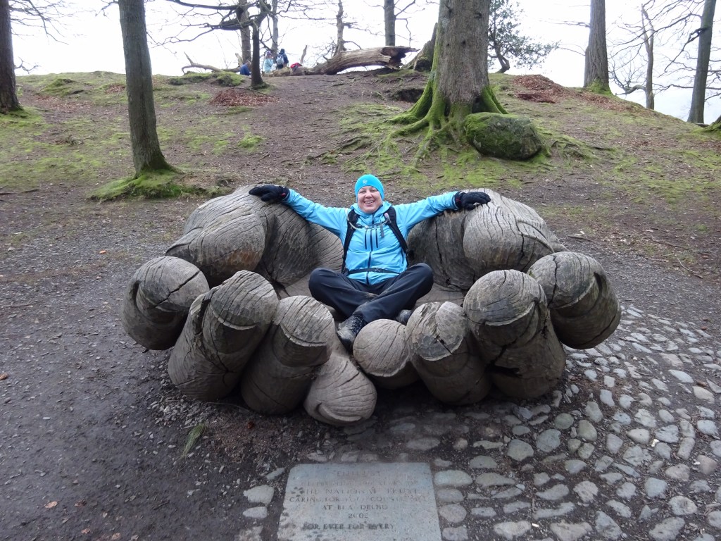 The walk back was along Derwent Water and was lovely through the trees. The giant hands carved out of wood were a feature installed to recognise 100 years of the National Trust. I couldn’t resist ….