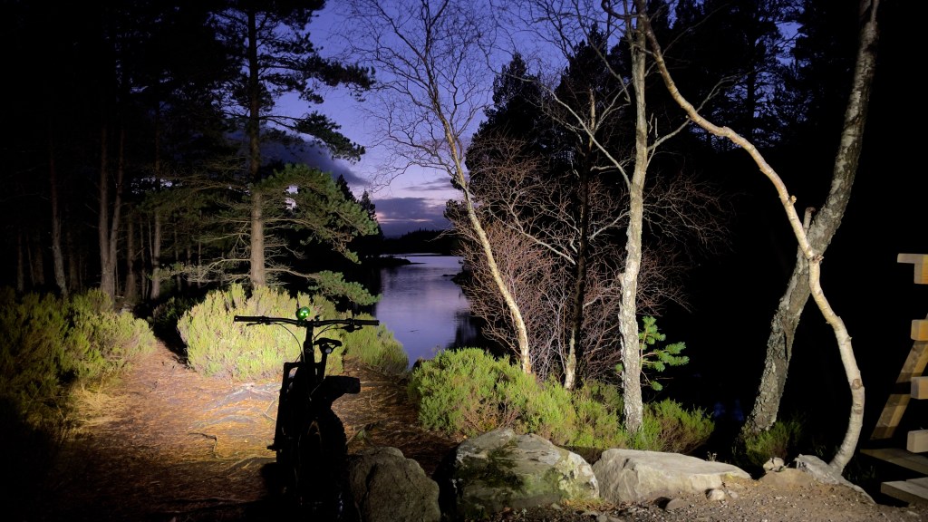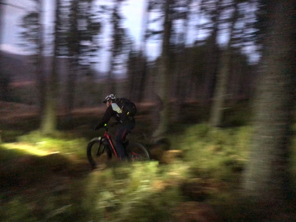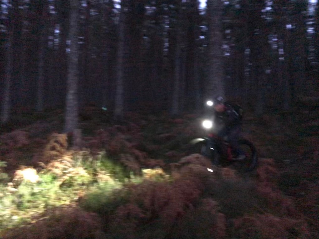 After a series of never ending zoom and audio conference calls we headed out for an evening bike ride. The sun set as we cycled down the Bothy Run and we enjoyed the fun of night riding on the way back. Riding with the lights in the woods creates a very different experience which is exciting and scary at the same time.