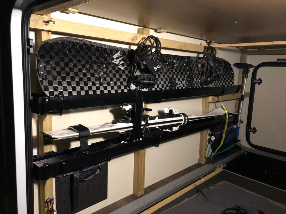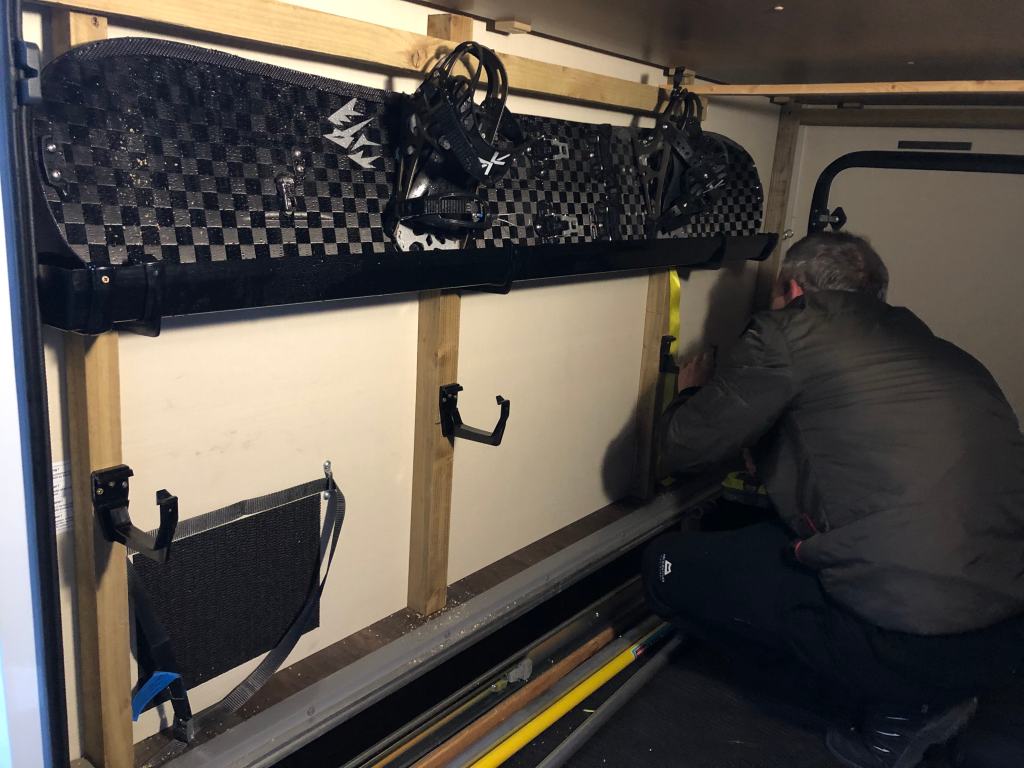 We’d been mulling over the design for some time now and headed off to the DIY shops to see what we could find. It turned out that this black guttering did the trick just perfectly. We were able to mount the gutter rails along the back wall of the van to keep the ski equipment out of the way and also to catch any drips from the wet equipment.