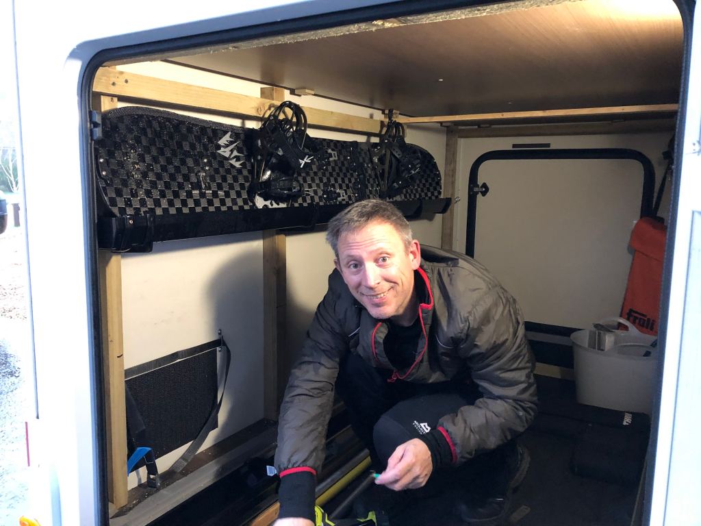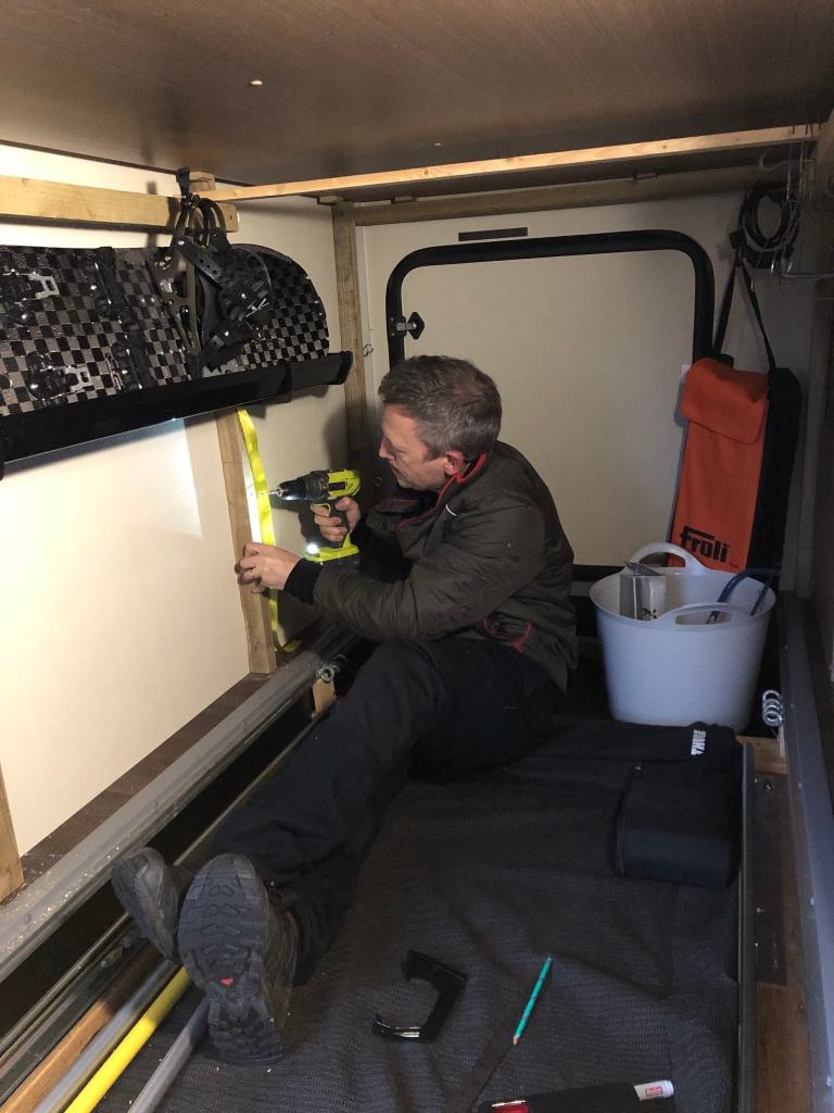 Yesterday we made some adaptations to the van garage as we wanted to accommodate the ski equipment alongside the bikes. We plan to spend a lot of time in Aviemore this winter and will therefore have the option of skiing on the hill or cycling in the Rothiemurchus estate all in one visit. Great flexibility but means carrying more gear!