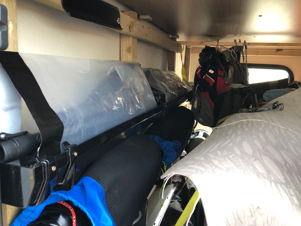 These rafts pack down very small as they are designed to take them on the bike. Ideal therefore for sticking in the van in case we end up camping near a river or lake we can access. Those ski racks adaptations we made also hold boats and paddles!