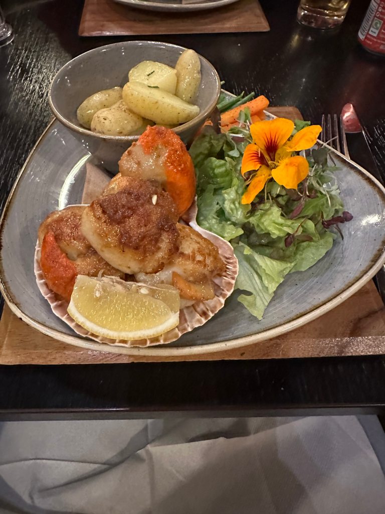 And to finish off a lovely couple of days, this evening we ate locally caught seafood in the Am Fuaran restaurant – oysters, langoustines and scallops. Yummy.