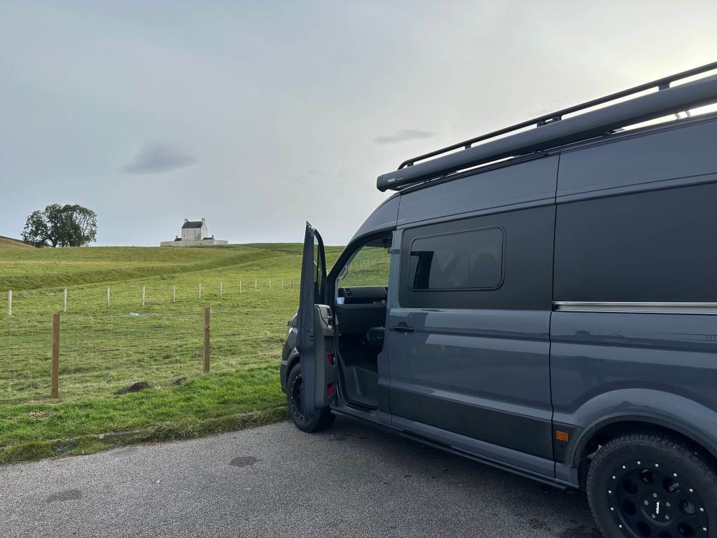 As the start point was 2.5 hrs from home we decided to drive up on Saturday and spend the night at Braemar so we’d be close by on Sunday morning. As we packed the van up in pouring rain we decided to test the waterproof rear door cover we had purchased to keep the rain out in exactly this situation. Good thing we were in high spirits as the test wasn’t so successful and we ended up getting quite wet but at least we have a plan now of how to amend the design and make it better. A blog of that adaptation to come soon….
