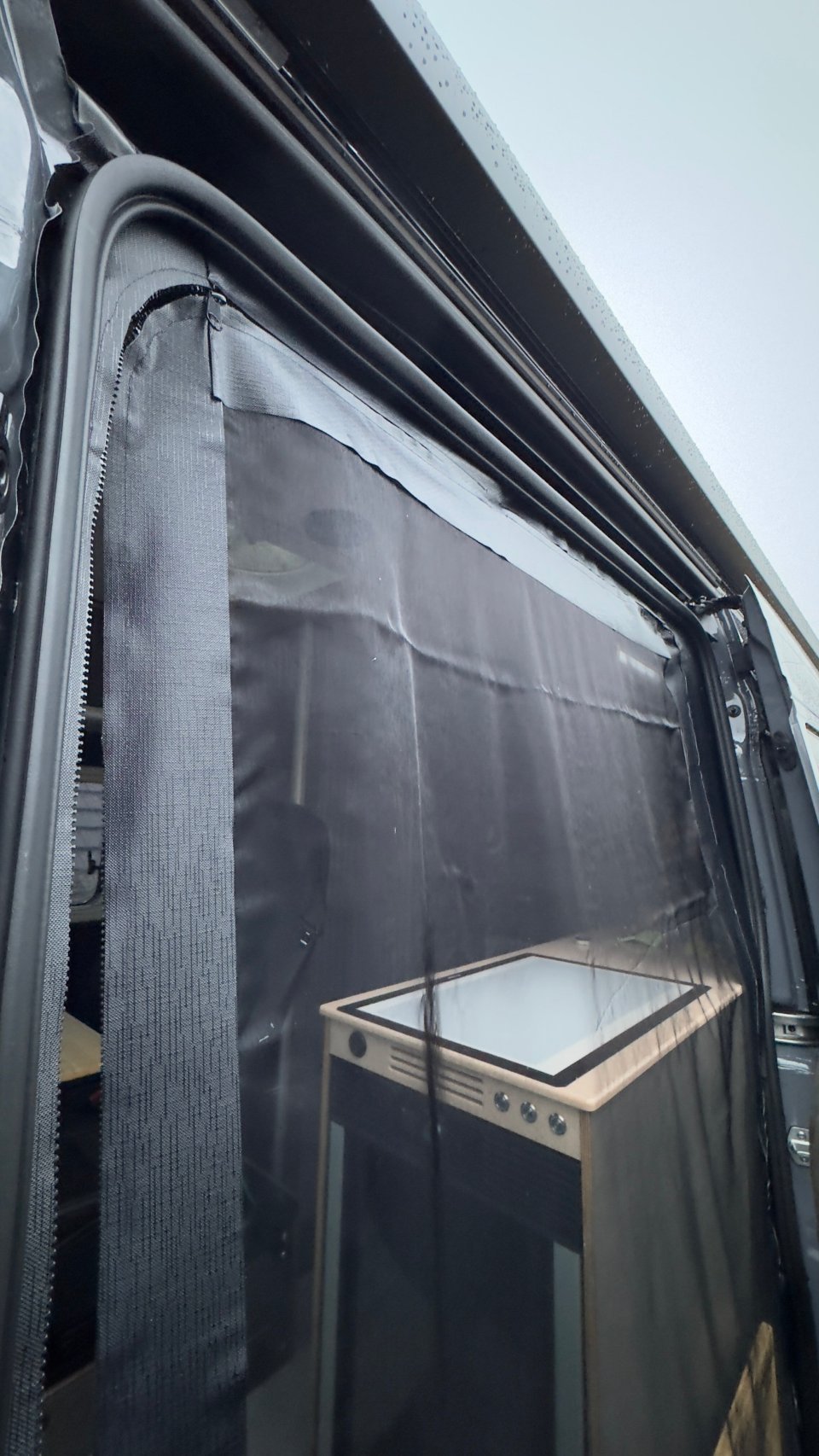 Having seen how the van’s rear barn door cover is fitted by Vanworx made by Ridgeline, Illya went about designing a midge mesh cover for the van’s sliding door himself. There were several criteria for the mesh cover: