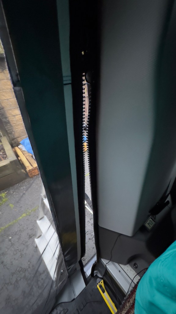Having lived in Scotland for 15 years, luckily we had already found a Scottish supplier of a fine mesh fabric that we had used to build covers for tents and our previous van to keep the midges at bay. So we then thought all Illya had to do was fix the anti-midge mesh to the proposed mosquito door cover. Simple? No! Vanworx stopped supplying the door cover as with the van’s curved door and the lack of a gap between it and the kitchen counter top, eventually the mesh door would break.